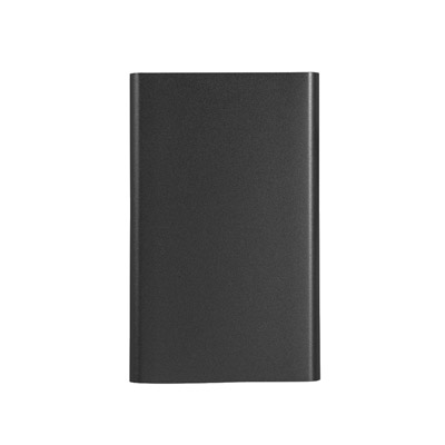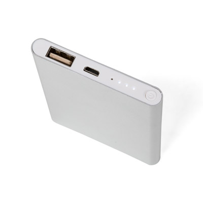 Power bank de metal com indicador de carga em led. Corpo metálico de design fino com detalhe branco nas laterais, “entrada” e “saída” de 5v, 4 indicadores de carga em led azul e botao liga/desliga, 2000mAh. Acompanha cabo USB e adaptador Lightning(IPHONE).