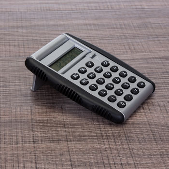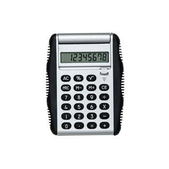 Calculadora plástica de 8 dígitos com bordas emborrachadas em relevo. Possui compartimento flexível, basta puxar “botão” para baixo que a tampa protetora irá levantar e servirá de apoio, acompanha uma bateria AG10.