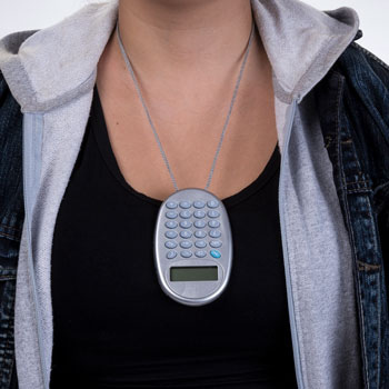 Calculadora plástica oval de 8 dígitos prata com cordão e acessórios coloridos, necessita de 1 bateria AG10 para funcionamento (acompanha).