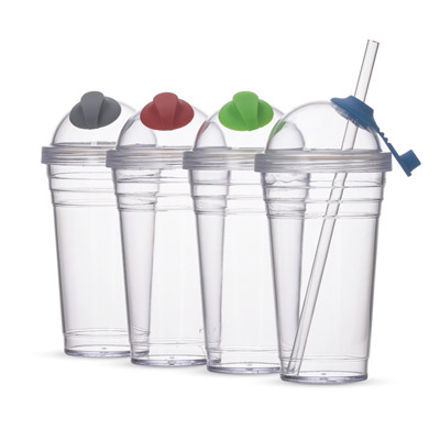 Copo plástico 480ml com tampa e canudo. Material plástico transparente resistente e rígido, possui três faixa superiores em relevo, tampa rosqueável de formato esférico com tampa emborrachada para canudo. Acompanha canudo.