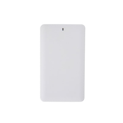 Power bank plástico com capacidade de 2000mAh. Com um design fino, seu material plástico é texturizado e lembra a elegância de um couro. Possui luz led indicativa, cor vermelha quando está sendo carregado e na cor azul quando transfere a carga. Possui adaptador Lightning(para Iphone) acoplado na parte interna/abaixo do cabo. Acompanha cabo USB.