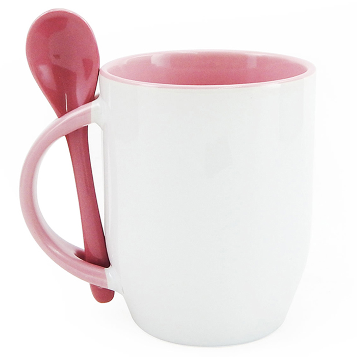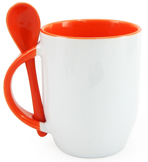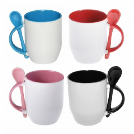 Caneca cerâmica branca, com parte interna colorida, cabo colorido com detalhe vazado na parte superior, para encaixar colher. Acompanha colher cerâmica colorida, com detalhe vazado no cabo.