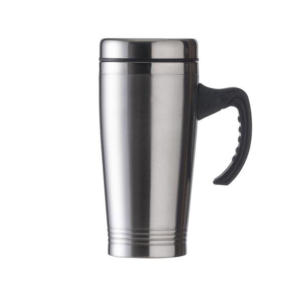 Caneca inox de 450ml, pegador de plástico e parte interna em inox. Tampa rosqueável.